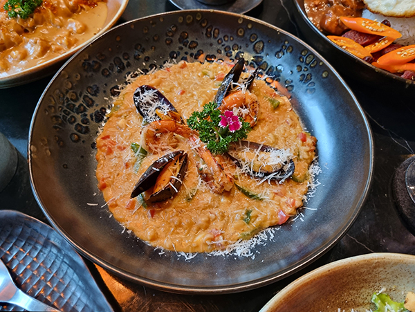 Seafood Risotto เป็นเมนูอาหารอิตาเลียนอีกเมนูที่ทางร้านรังสรรค์ออกมาได้เป็นอย่างดี โดยใช้เป็นข้าวรีซอตโต นำมาผัด จะมี กุ้ง ปลาหมึก หอยแลงภู่ดำ มะเขือเทศพีชหอมหวาน พริกหวาน พาเมซานชีส รีซอสโตมีความครีมที่มาก รสชาติกลมกล่อมและที่สำคัญทางร้านเลือกใช้วัตถุดิบที่สดใหม่ ทำให้ยิ่งน่าทานมากขึ้น
